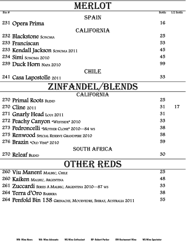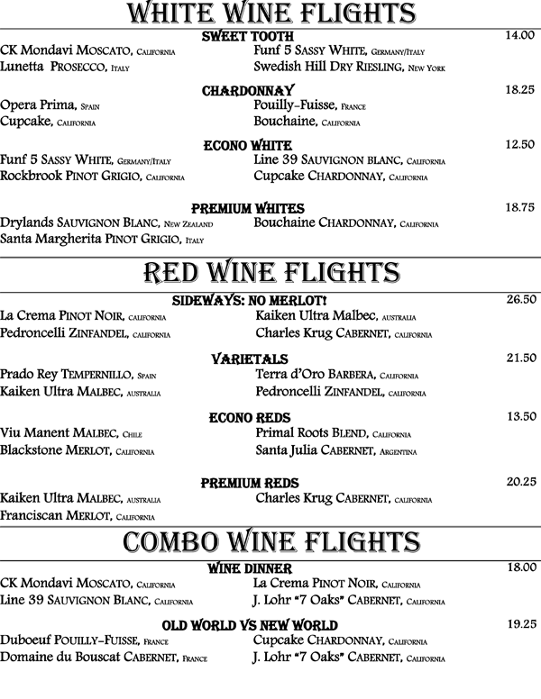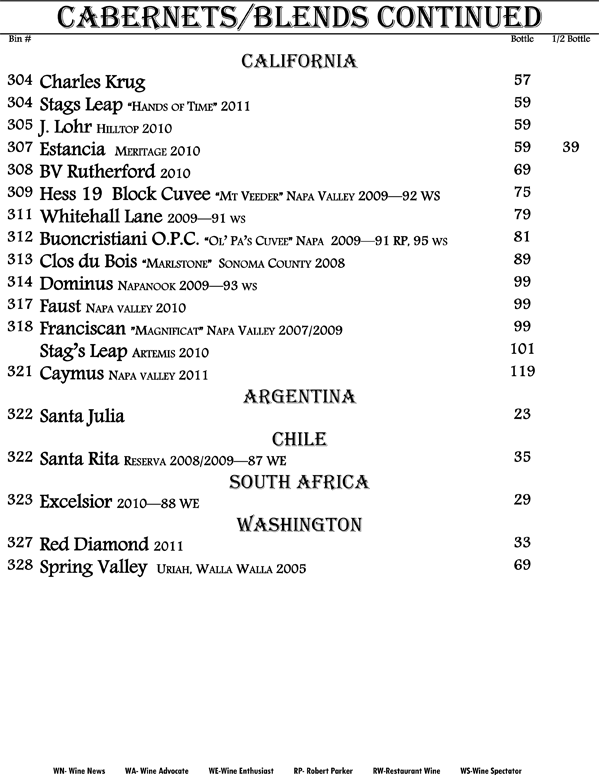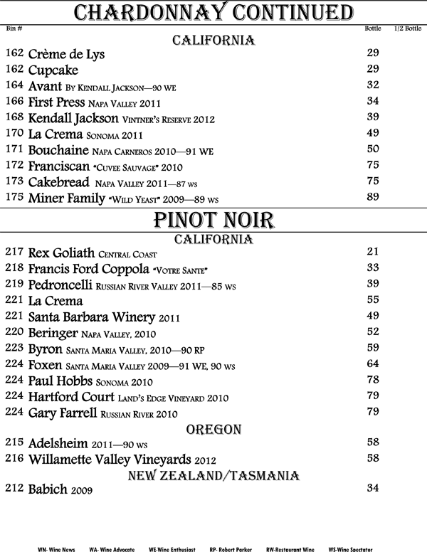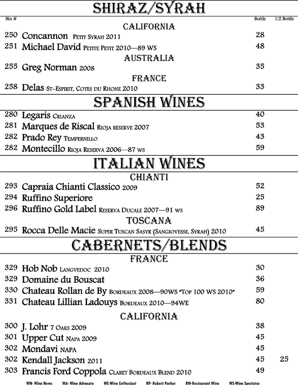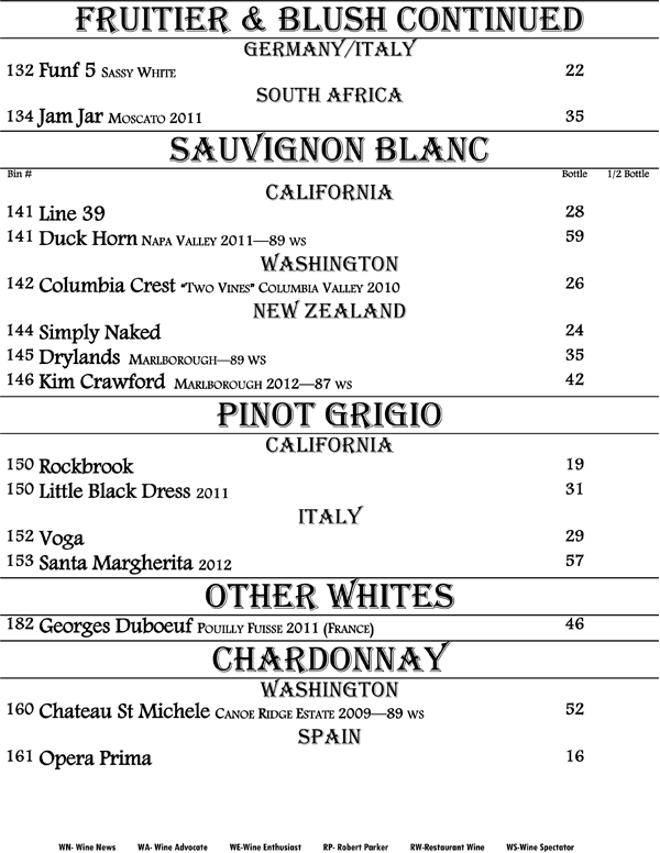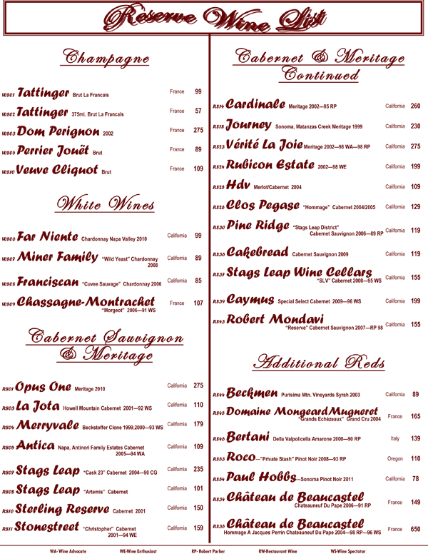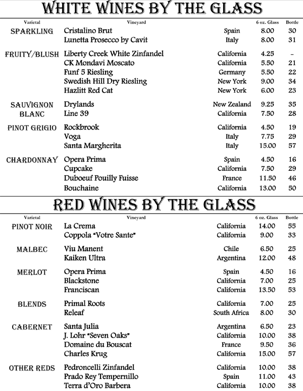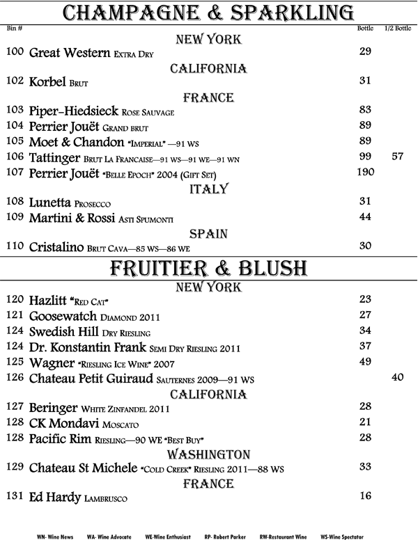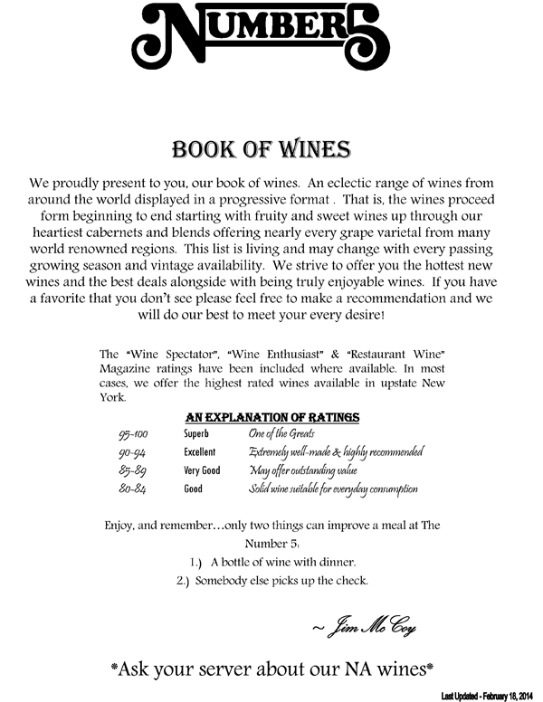 We proudly present to you our book of wines. An eclectic range of wines from around the world displayed in a progressive format. That is, the wines proceed from beginning to end starting with fruity and sweet wines up through our heartiest cabernets and blends offering nearly every grape varietal from many world renowned regions. The list is living and may change with every passing growing season and vintage availability. We strive to offer you the hottest new wines and the best deals alongside with being truly enjoyable wines.
